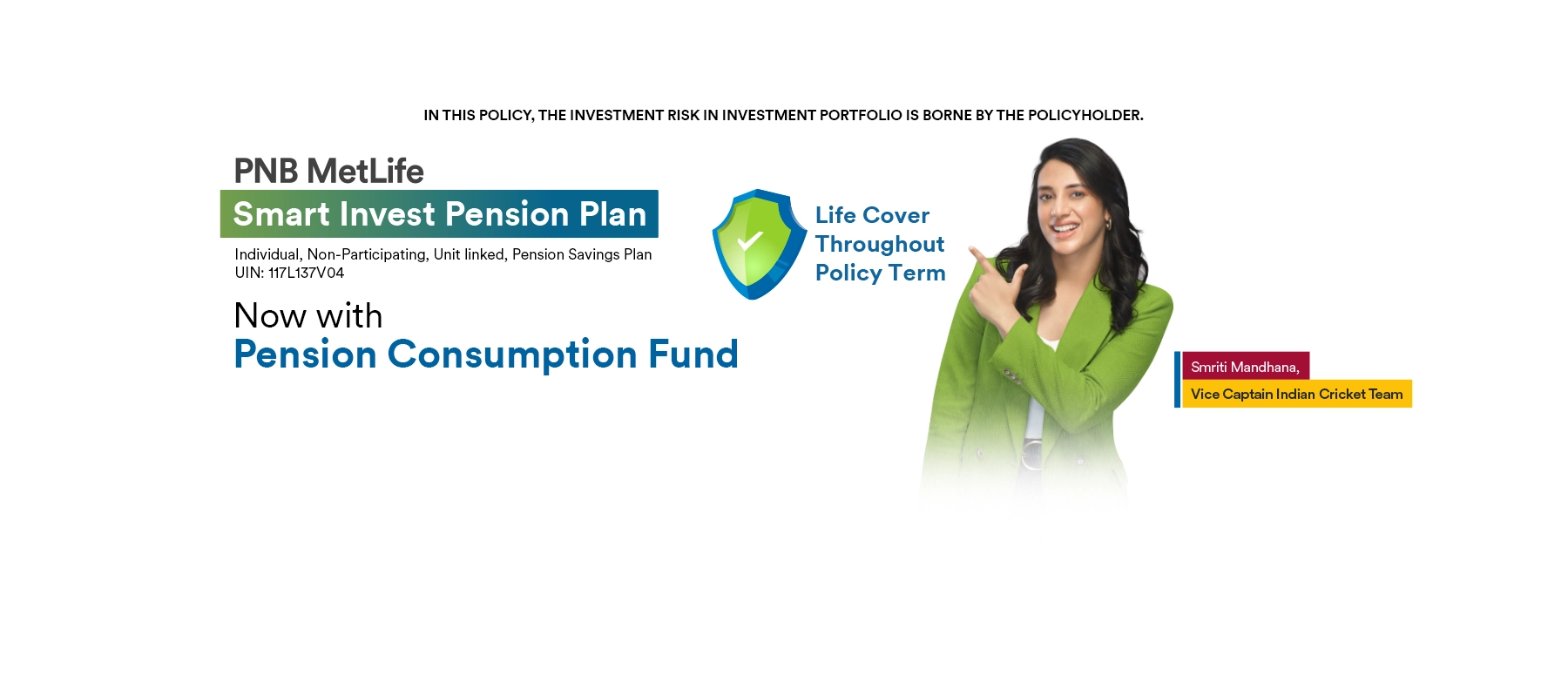 #Provided all premiums being paid and vesting benefit proceeds provide annuity income. Unit Linked Life Insurance products are different from the traditional insurance products and are subject to the risk factors. The premium paid in Unit Linked Insurance policies are subject to investment risks associated with capital markets and the NAVs of the units may go up or down based on the performance of fund and factors influencing the capital market and the insured is responsible for his/her decisions. PNB MetLife India Insurance Company Limited is only the name of the Life Insurance Company and PNB MetLife Smart Invest Pension Plan is only the name of the unit linked insurance contract and does not in any way indicate the quality of the contract, its future prospects or returns. Please know the associated risks and the applicable charges, from your Insurance agent or the Intermediary or policy document issued by the insurance company. The various funds offered under this contract are the names of the funds and do not in any way indicate the quality of these plans, their future prospects and returns. The past performance of the funds is not indicative of the future performance. The policyholder can know the value of policy wise units as per the FORM D02 through a secured login on the PNB MetLife website (www.pnbmetlife.com) Tax benefits are as per the Income Tax Act, 1961, & are subject to amendments made thereto from time to time. Please consult your tax consultant for more details. Goods and Services Tax (GST) shall be levied as per prevailing tax laws which are subject from time to time. For more details on risk factors, terms and conditions, please read the sales brochure before concluding any sale. For Further details on all the conditions exclusions related to product, please contact our insurance advisors.
